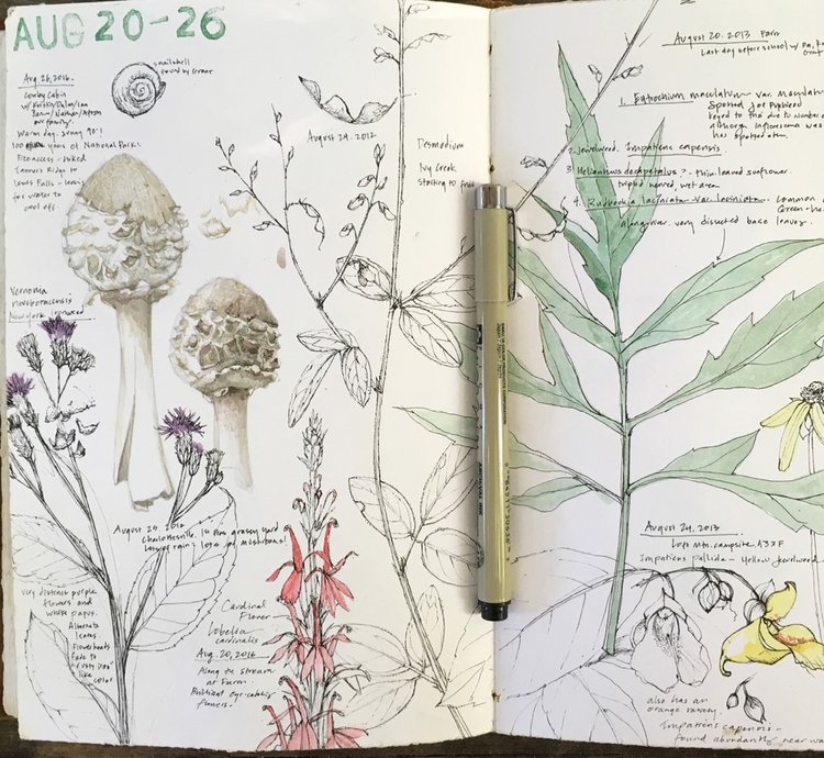 Lara Call Gastinger a élaboré en 2001 le concept de Perpetual journal, et transmets son fonctionnement très simple depuis. Il s'agit de dessiner, semaine après semaine, un élément de la nature observé. Une même double page / semaine peut être revisitée chaque année, enrichie de nouveaux croquis, comme sur cette image qui tisse entre elles des observations de 2012, 2013, 2016…