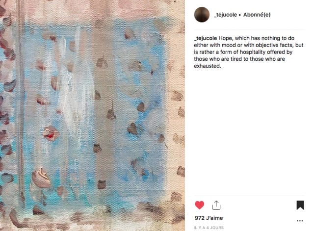 Pour finir avec ce qui a ouvert la collecte du jour, cette publication de Teju Cole sur instagram, qui me servira de leitmotiv jusqu'à ce que je ne sois plus que fatiguée :
